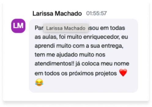 A cada 15 dias, temos encontros de supervisão no formato de hotseat, nos quais coloco toda minha experiência e conhecimento à sua disposição para tirar suas dúvidas de forma individual.