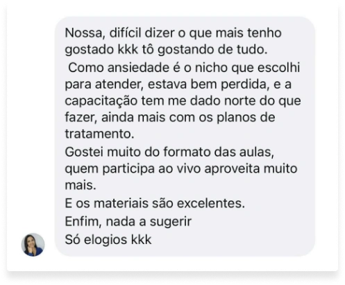 Você vai ter acesso a uma estrutura completa e ao meu acompanhamento pessoal para transformar a sua prática clínica e se tornar um expert no tratamento dos transtornos de ansiedade.